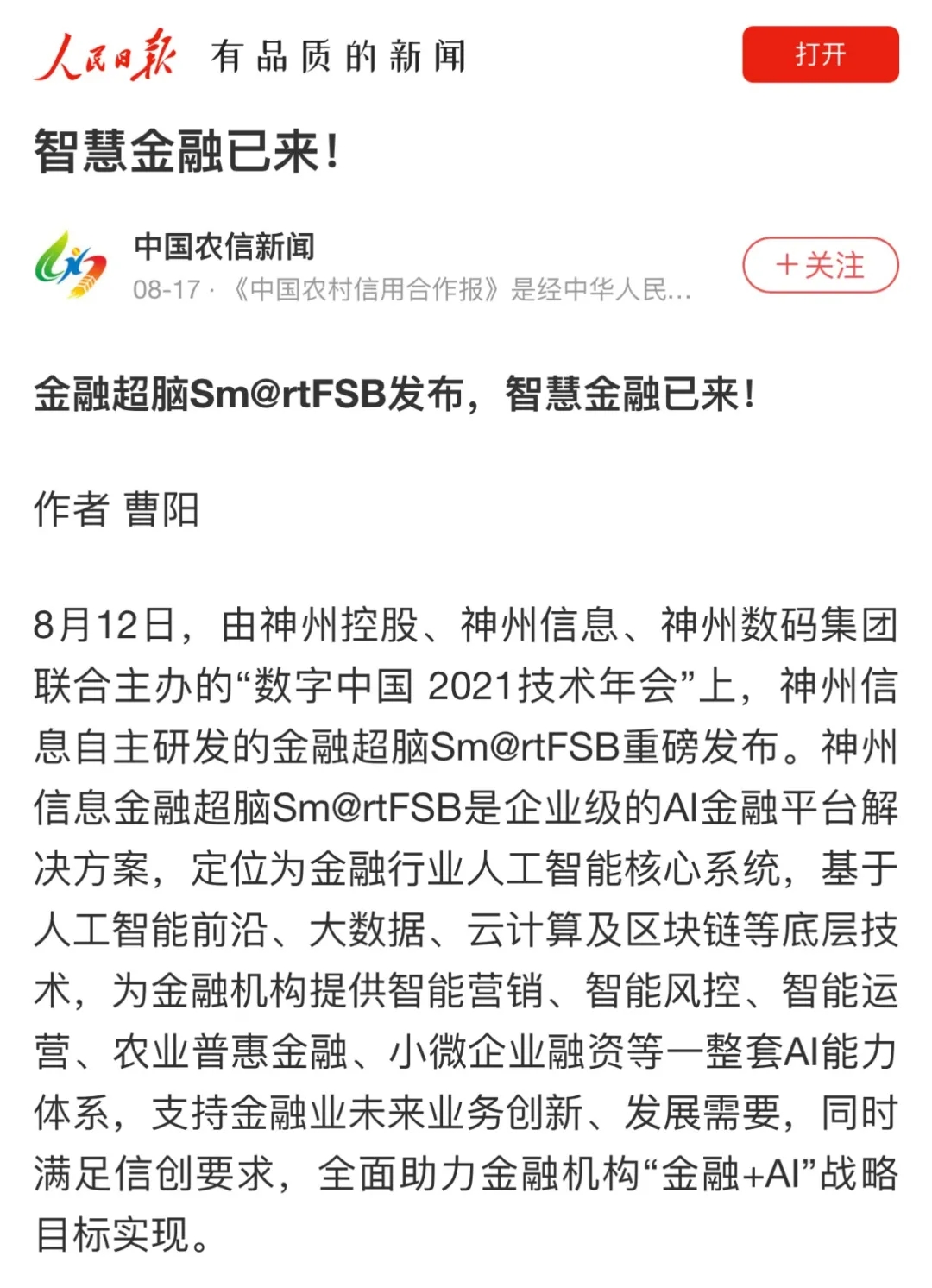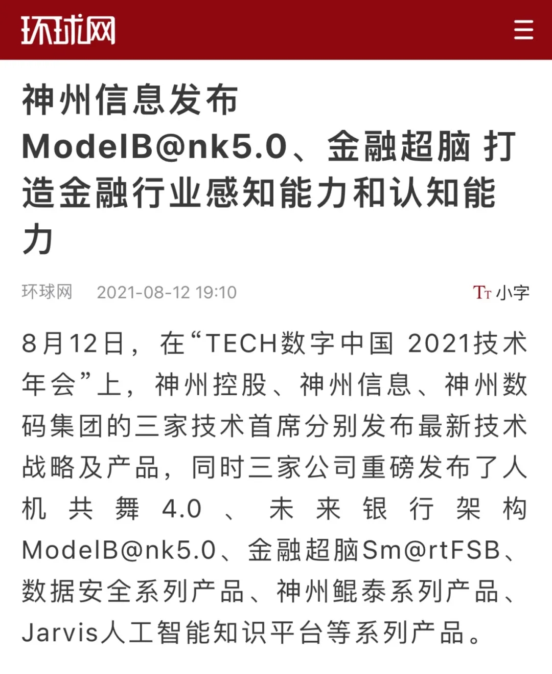 8月12日,由神州控股、BB贝博艾弗森官网、bb贝博艾弗森集团联合主办的“科技自强、数据融通、场景创新——TECH数字中国 2021技术年会”云上盛大启幕,发布神州信创云、ModelB@nk5.0、金融超脑Sm@rtFSB、云原生数字化安全底座、园区智能体等重磅产品,国内各大权威、影响力媒体多角度多频次对盛况进行报道!